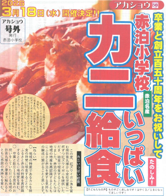 この度、佐渡市立赤泊小学校の創立150周年という記念すべき節目を機に、卒業を迎える児童の皆さんへお祝いの「浜茹で紅ズワイガニ」を提供いたしました。